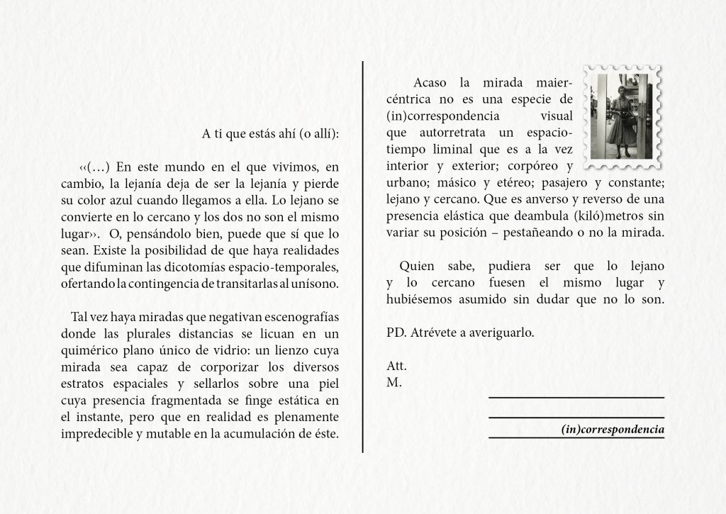 Acaso la mirada maier-céntrica no es una especie de (in)correspondencia visual que autorretrata un espacio-tiempo liminal que es a la vez interior y exterior; corpóreo y urbano; másico y etéreo; pasajero y constante; lejano y cercano. Que es anverso y reverso de una presencia elástica que deambula (kiló)metros sin variar su posición – pestañeando o no la mirada.